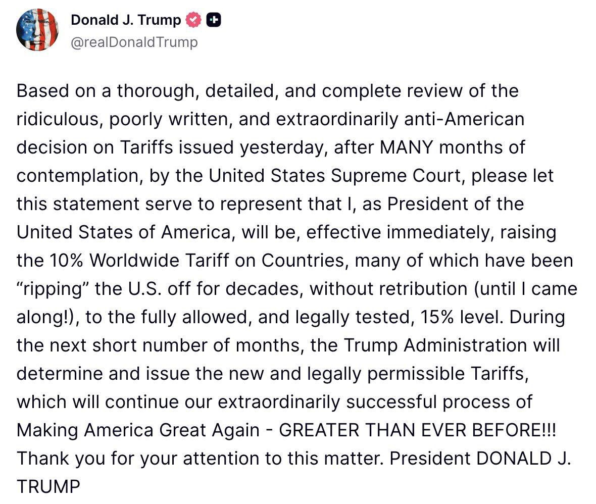 Ключевой момент: Повышение тарифов Трампом с 10% до 15% после решения Верховного суда США. Это может существенно повлиять на экономику.